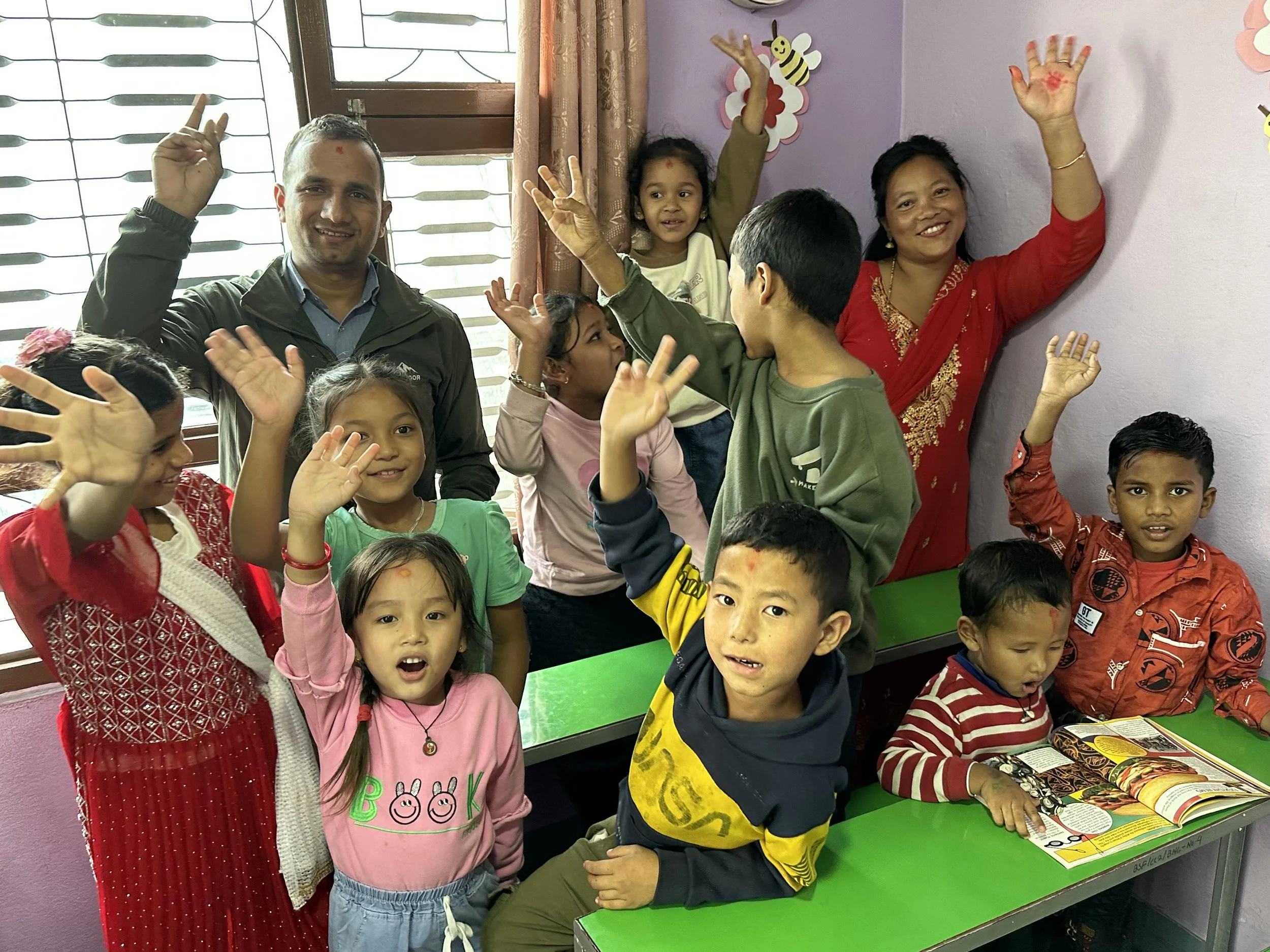 Additionally, we participated in Puja, engaging in ceremonial acts of worship, where we placed Tika on the foreheads of the children and staff and offered delicious treats to the kids.