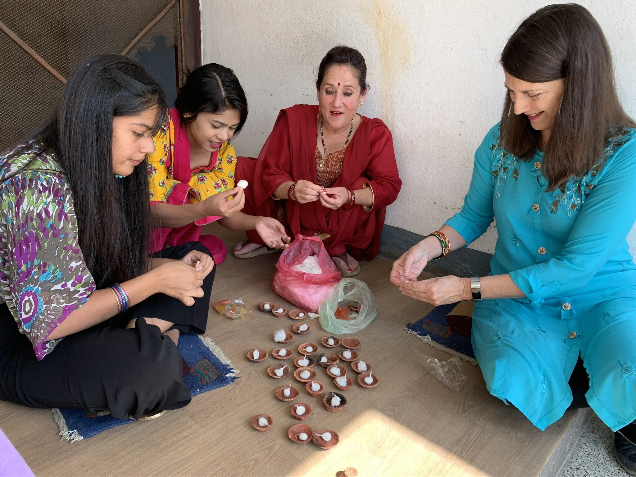 Brahmi, Rogina, Sarita and Christine prepare the clay oil pots