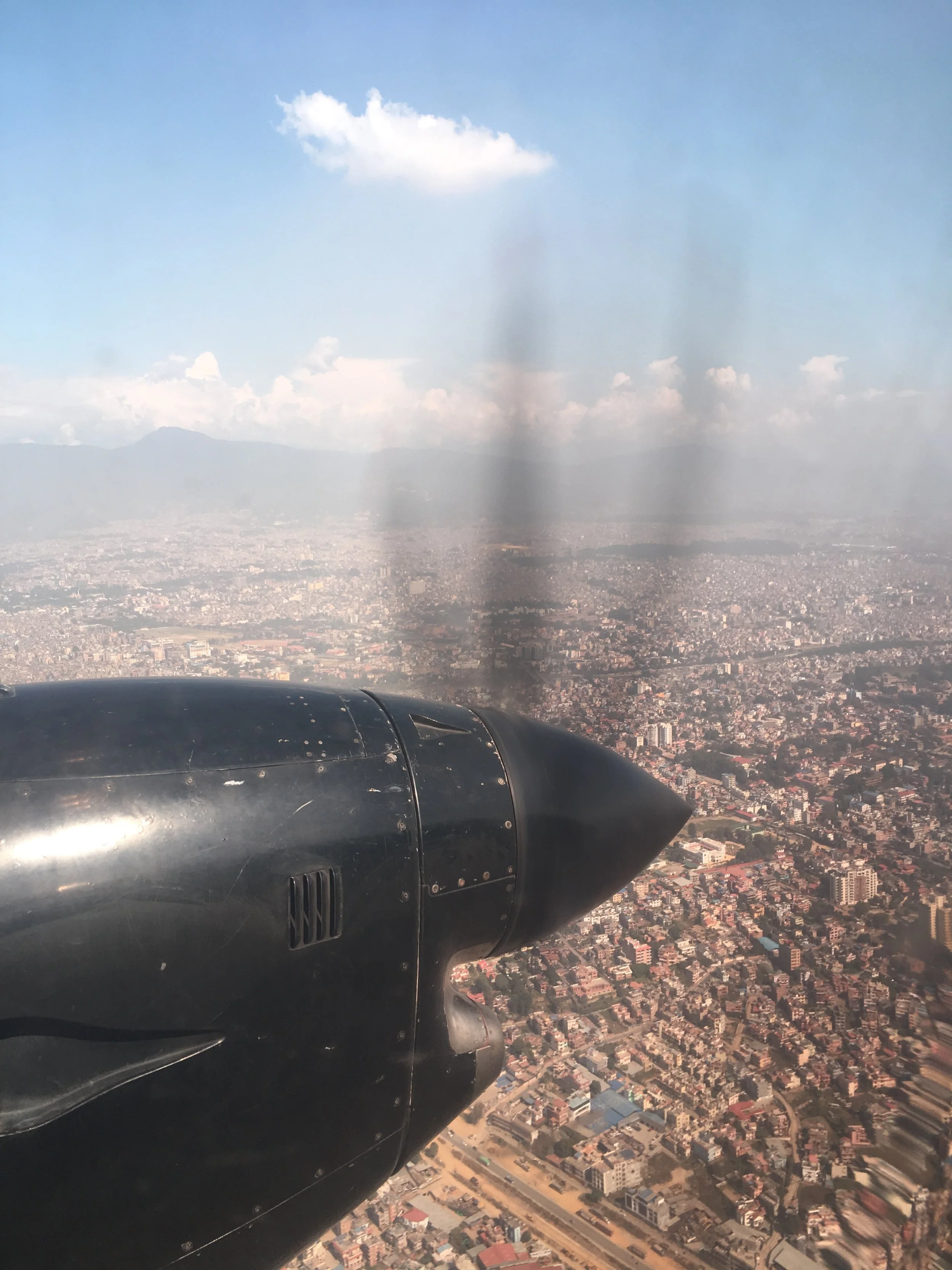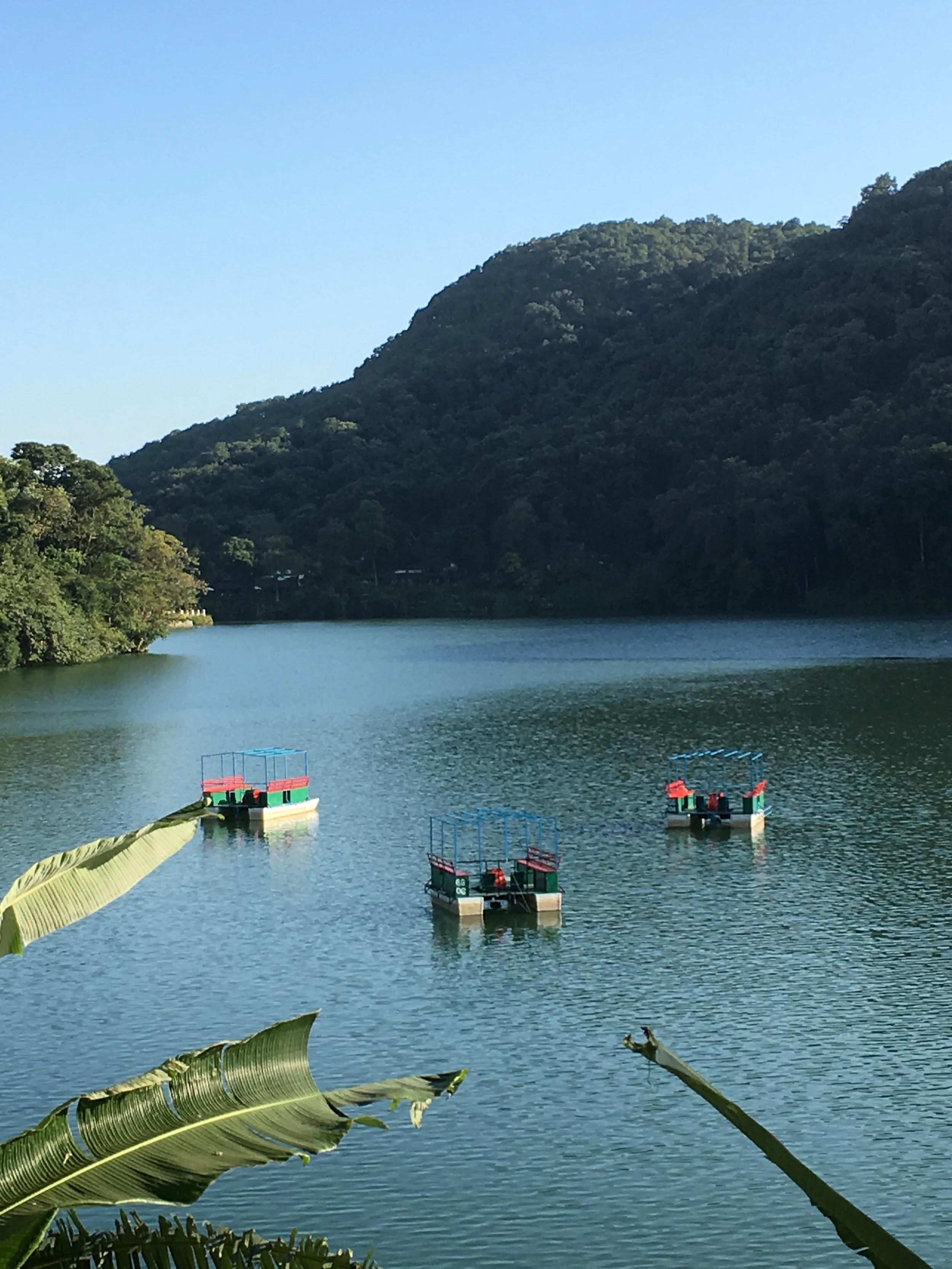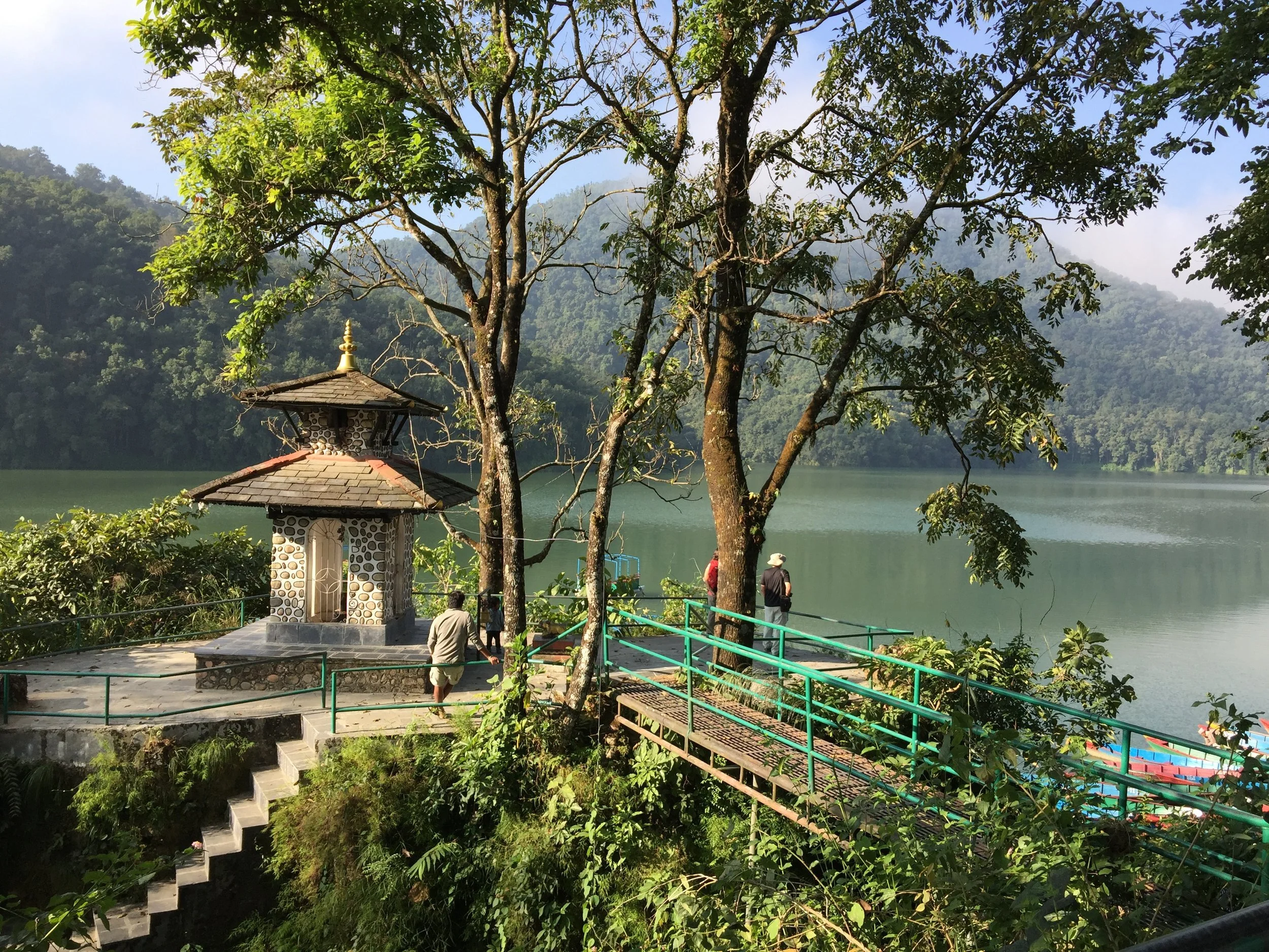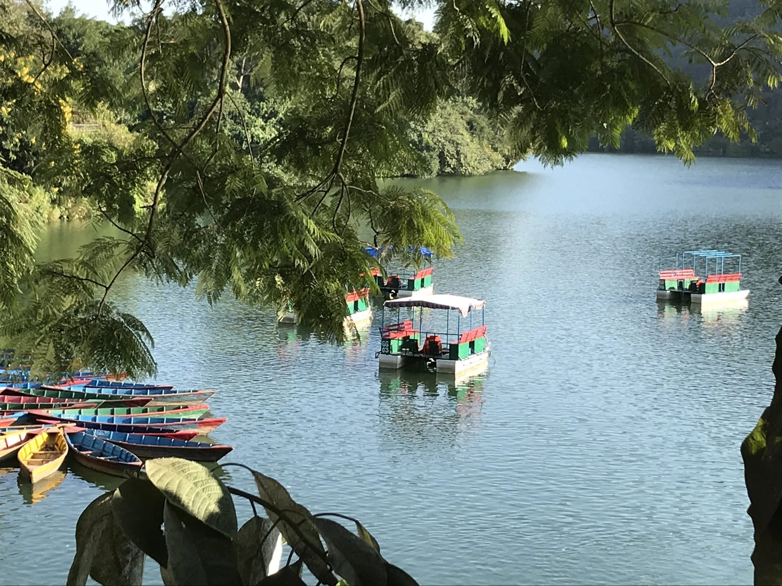 Part of the beauty of Pokhara is Lake Phewa located by the tourist hotels and a string of shops selling Nepali goods. Pam and Nancy rented a boat with a guide for a water tour. It was a sunny day with a slight breeze and the water was calm. Our guide pointed out a beautiful blue kingfisher who stayed in place as the boat glided beneath his branch. In the center of the lake is a small temple. It is normally filled with local people performing “puja”, or worship and this day was no exception. The island is very small; one can walk from side to side in about one hundred steps. Most Nepali's arrive in taxi-like paddle boats. Our guide mentioned that paddling those boats is a hard job. Upon our return we took pictures of groups of multicolored canoes. The next morning we left Pokhara with stunning Himalayan views from the airport and took a short prop plane ride through the valley back to Kathmandu. A great time in Pokhara!