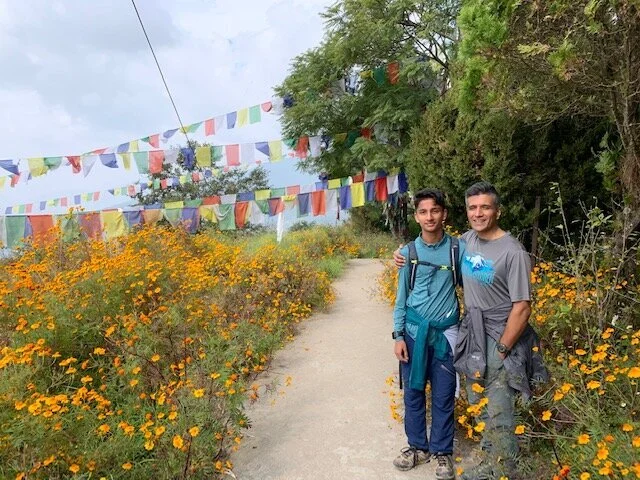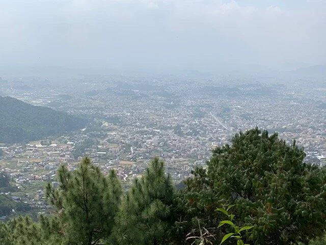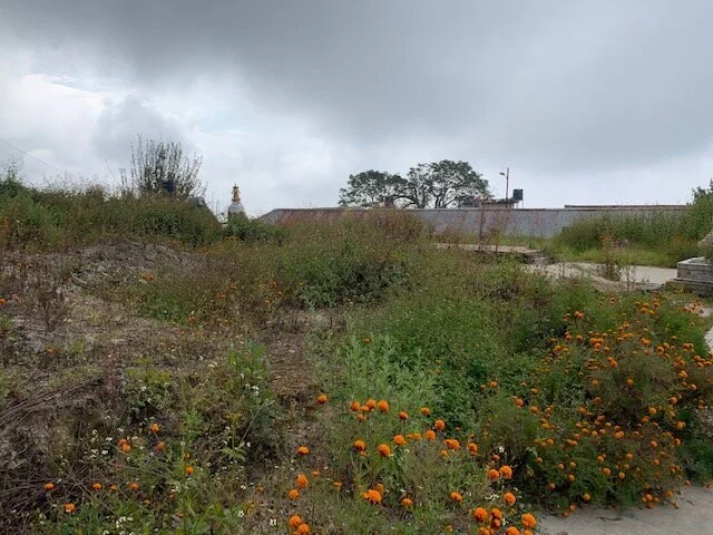 After climbing the steps, we were rewarded with paths marked by thick golden flowers and plants and gorgeous views of the Kathmandu valley.