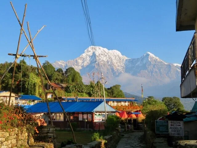For those of you old enough to remember the movie Rocky, do you recall the scene where Sylvester Stallone runs up the steps of the Philadelphia library and then turns around to look down on the city and view his achievement, accompanied by a musical score that soars triumphantly? Well, that’s how I felt after hiking from the town of Kande (5,580 ft) up to Australian Camp, (6,760 feet). The hike is VERY steep, practically straight up, and the trail itself is very rocky and uneven. That particular hike is considered to be the easiest one in the Annapurna circuit; however, coming from the river city of St. Louis, Missouri where the altitude is 466 feet, I had to pause every few minutes to catch my breath.