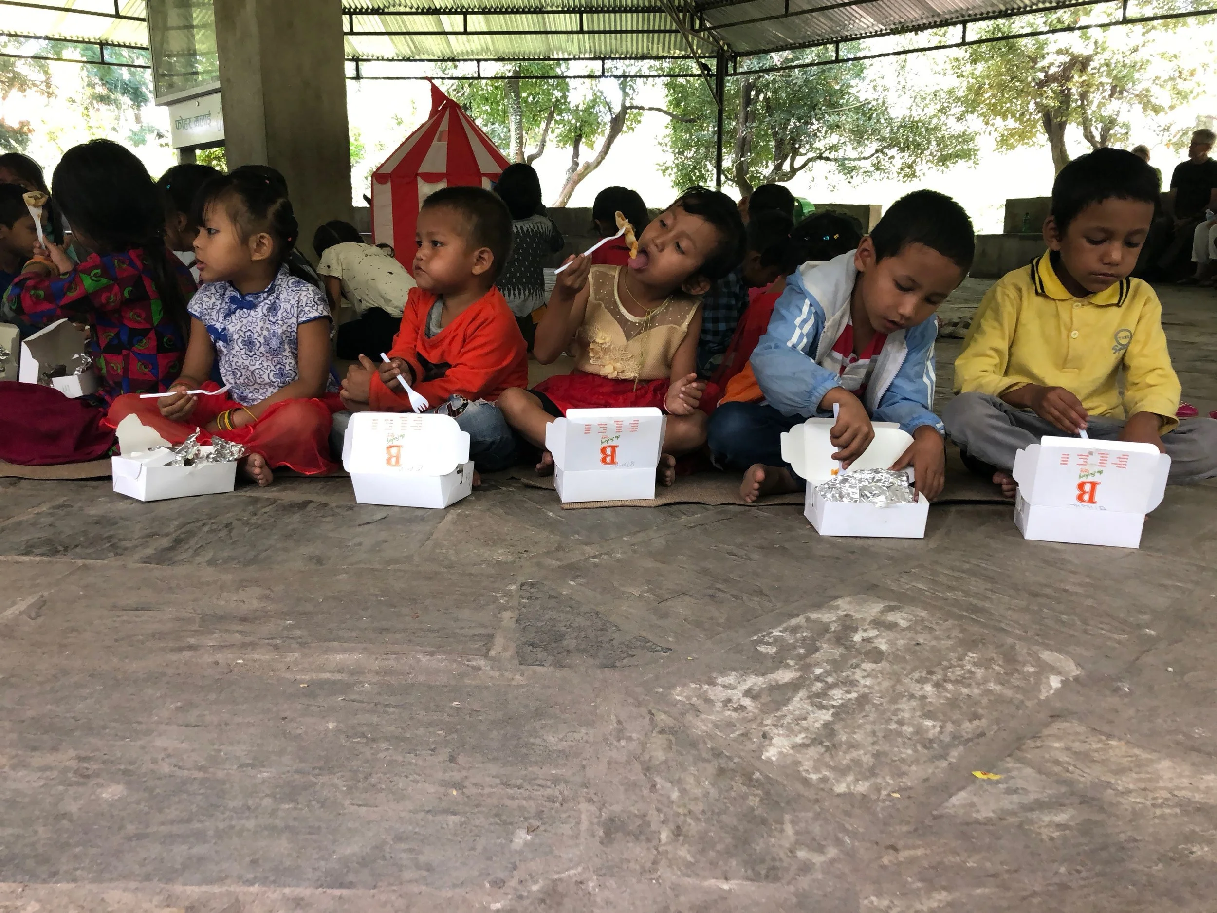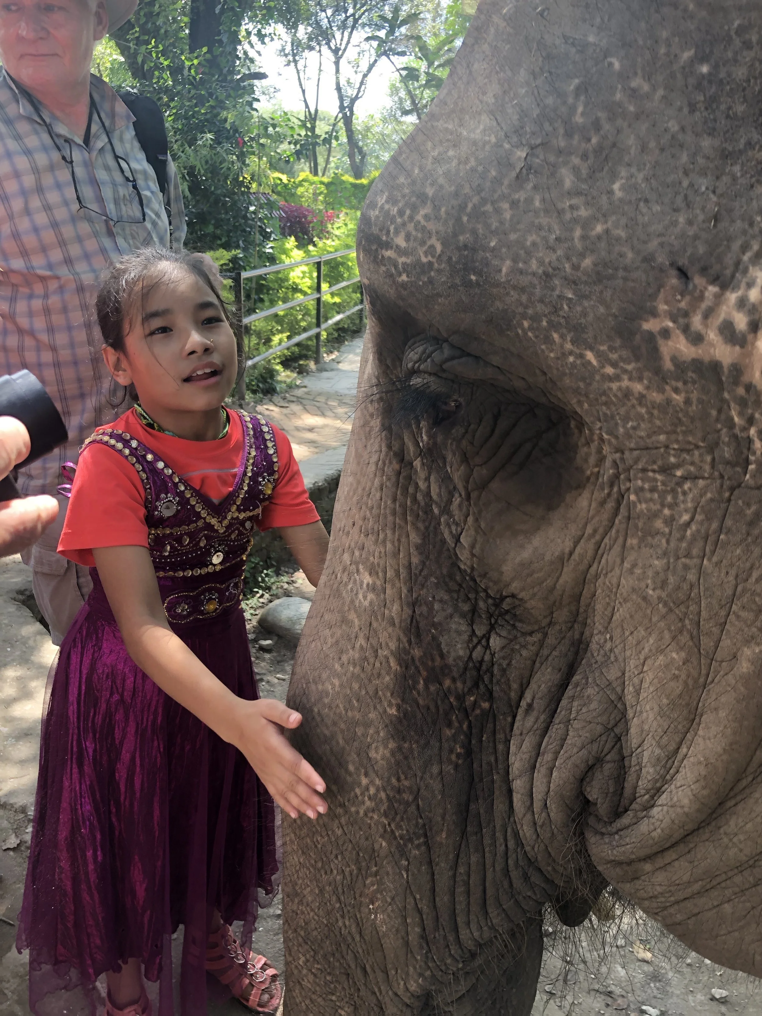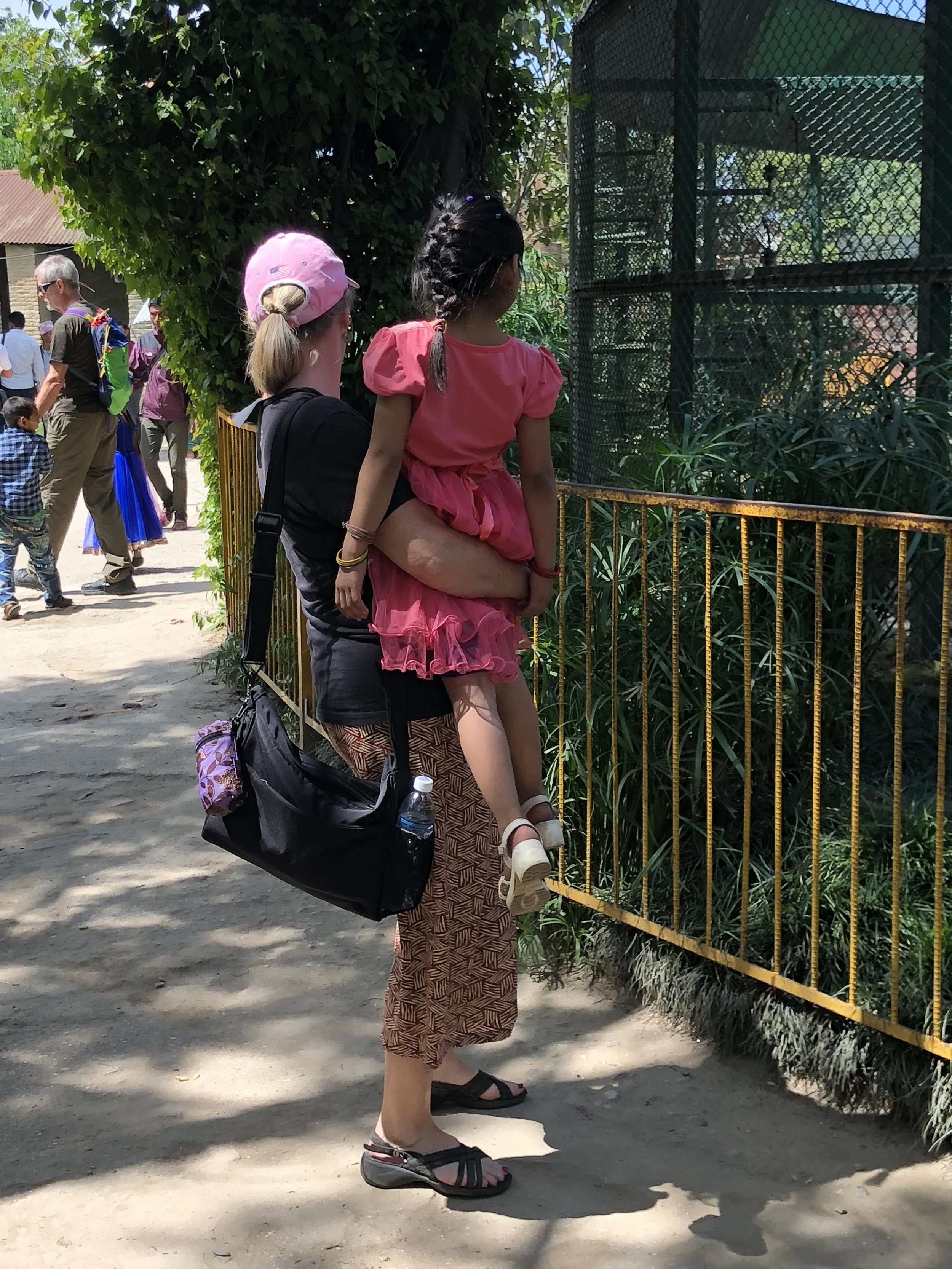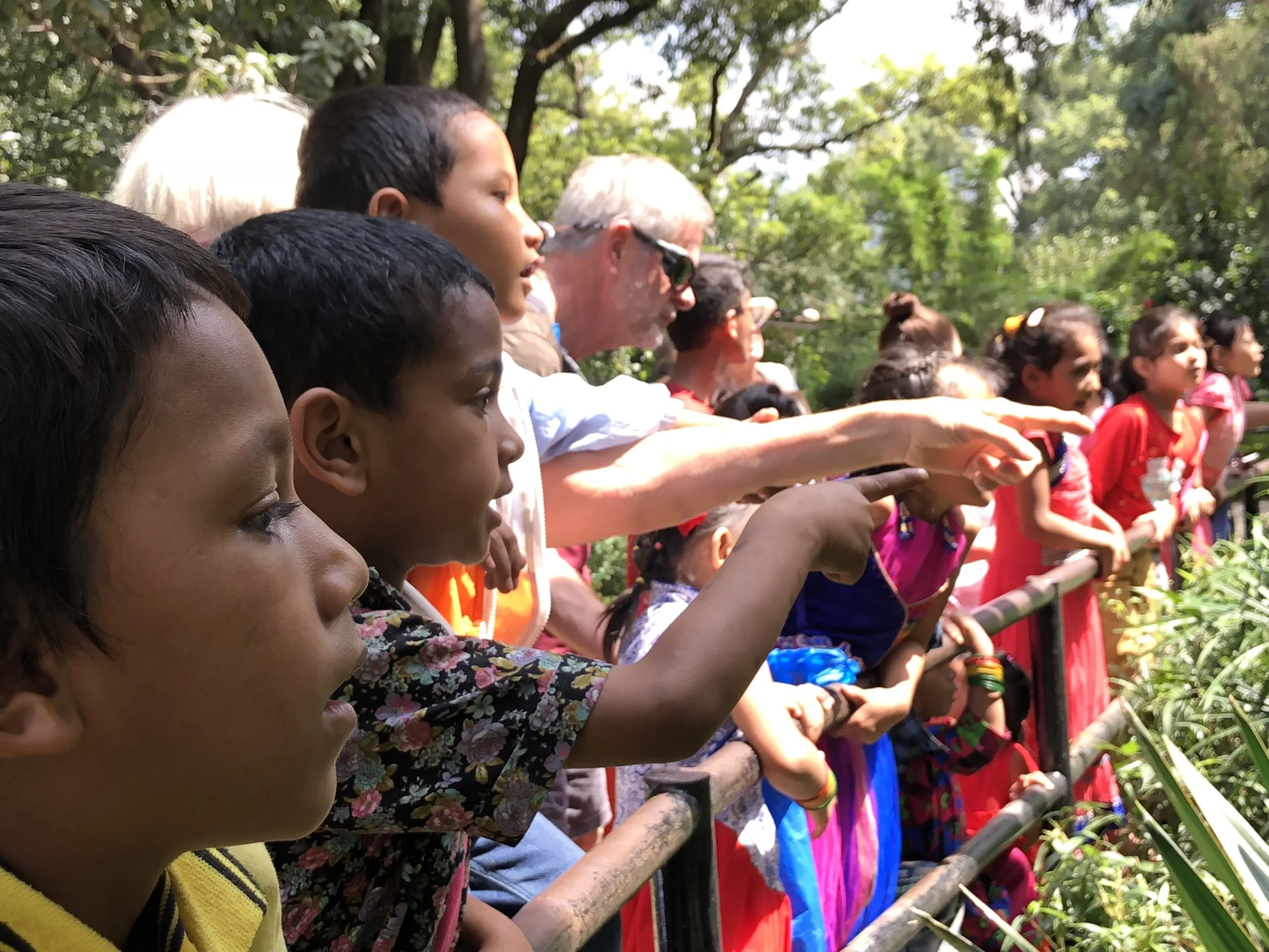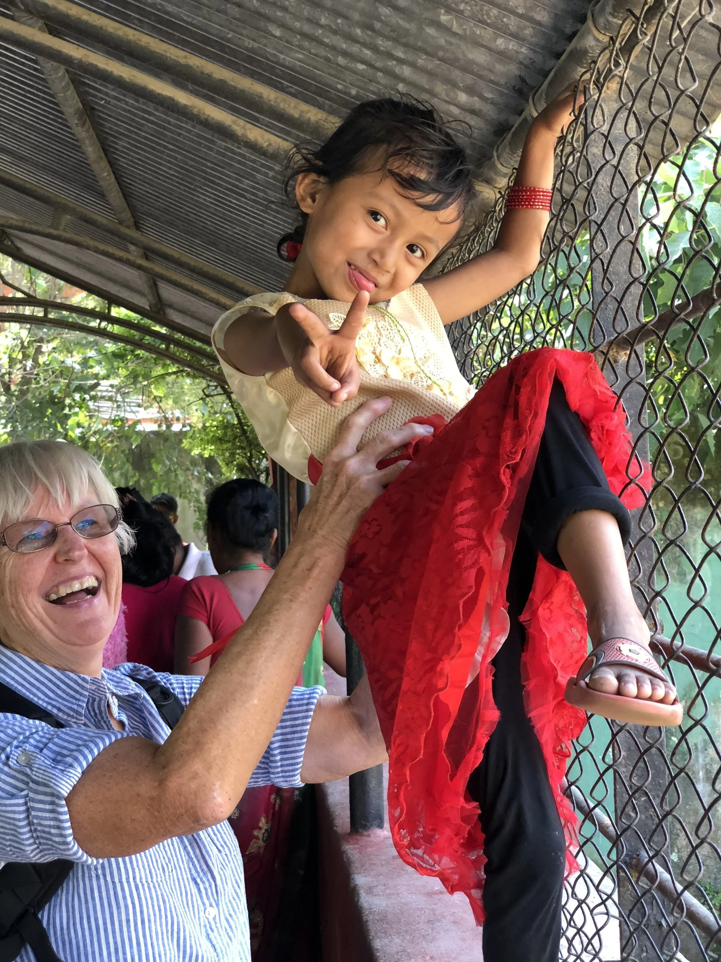 Once again we were treated to the contrast that Nepal offers. Skies were blue as we met the younger children at the pungent Kathmandu Zoo. They were dressed in their holiday best as they collected to sing for us and then take us by the hand, bounced around happily, and used English names for their favorite animals. Some of them met the elephant up close, and the hippo was a big favorite. It showed off its enormous mouth and tongue for everyone before its carrot lunch arrived, and many of the children stood by fascinated while it ate a big bag of carrots. Then we all feasted together on human food of mo-mos and pizza. It is so heart-warming to share their joy and their appetites, knowing they are being cared for and fed and loved by the wonderful staff at the Contact Center.